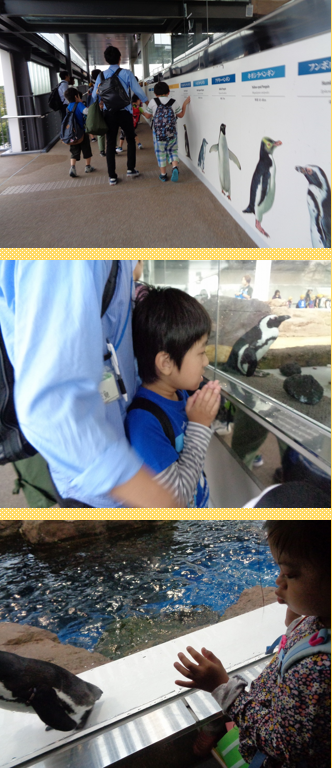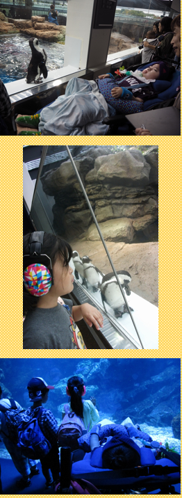 ペンギンやクラゲ,エイなどの魚たちを見て,「おとと。」