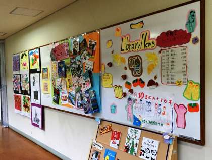 中棟1階の図書室前の掲示板に,京都市幼児・児童・生徒作品展及び姉妹都市交歓作品展に出展した作品を展示しています。