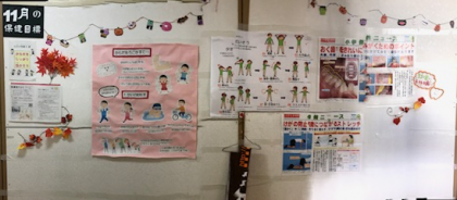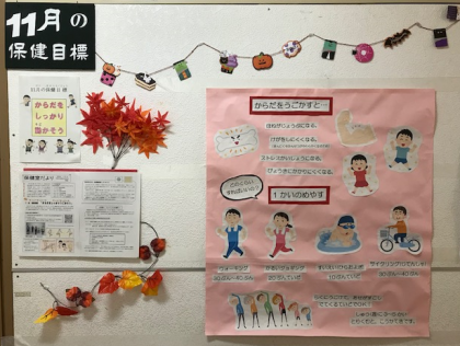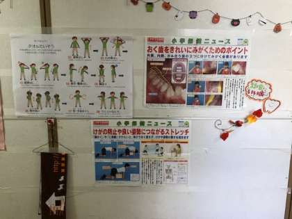 保健室の前に,「タオルたいそう」などが紹介されています。
