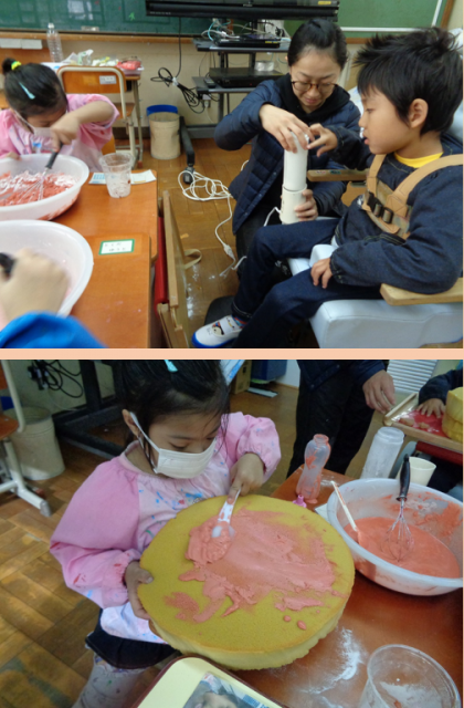 クリーム係の友だちは,泡だて器やミキサーで水と粉を混ぜ,へらでスポンジにのせました。