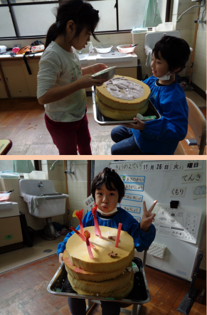 みんなで大きなケーキを作って遊びました。
