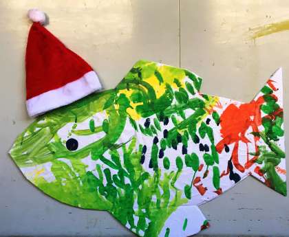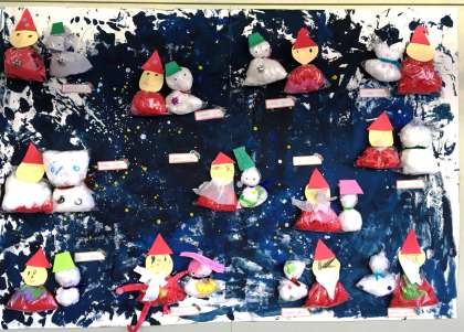 小学部2年生の教室前廊下に展示されている「ふゆがやってきた」の作品です。