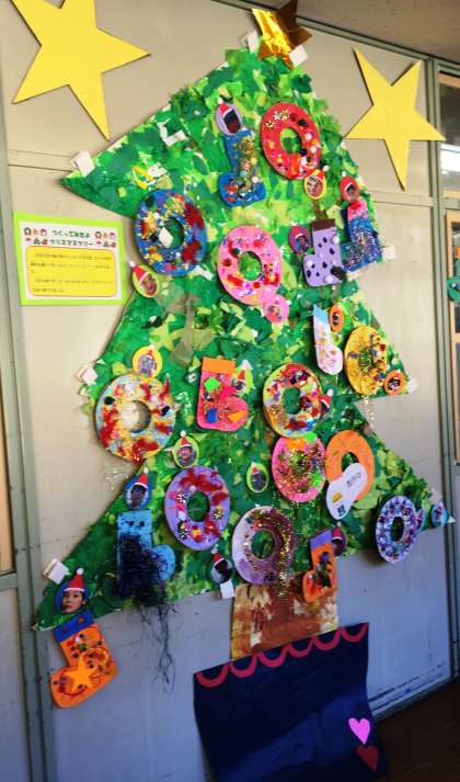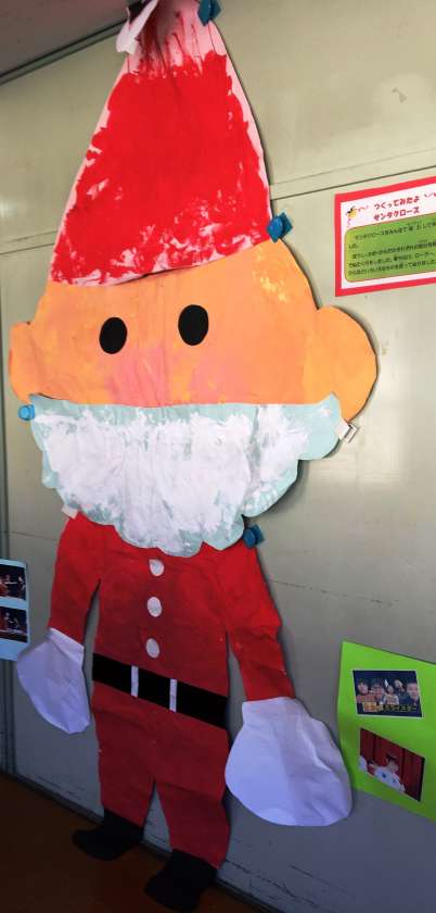 小学部3年生の教室前廊下に展示されている「つくってみたよ サンタクロース」,「つくってみたよ クリスマスツリー」です。