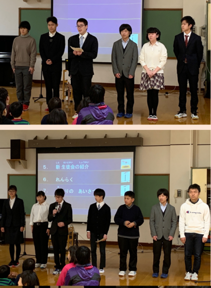 校長先生から「今年がんばること」などのお話のあと,これまでみんなのためにがんばってくれた生徒会からあいさつがありました。そして,新しい生徒会と新たに西総合の仲間になった児童の紹介が行われました。