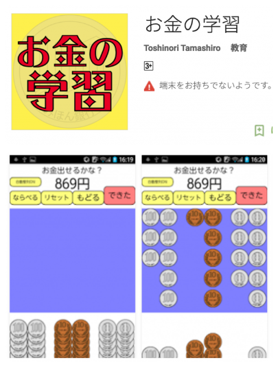 お金の学習アプリです。表示された金額になるように,真ん中の青い四角の中に硬貨を移動することにより,正解か,多いか,少ないか確認できます。レベルごとに,お金の種類を変えています。