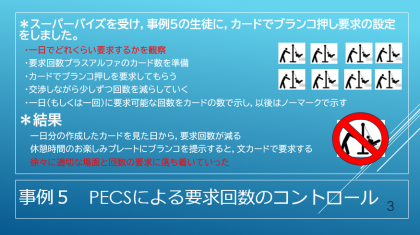 休憩時間のお楽しみプレートにブランコを提示すると文カードで要求することができるようになってきており,徐々に適切な場面と回数の要求に落ち着いてきています。
