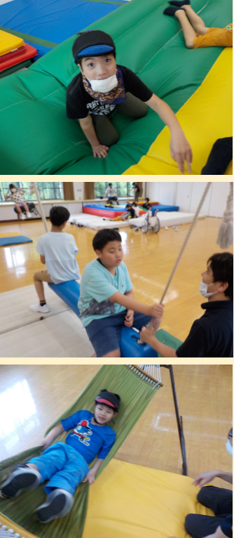 エアトランポリン,タイヤブランコ,ハンモック,スイングホースの中から自分が一番やりたい場所を選んで,揺れを感じました。