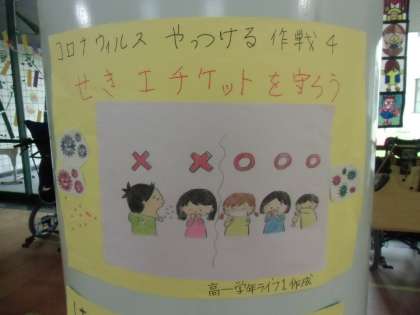 高等部1年学年ライフで「マスクのつけ方」「せきエチケットを守ろう」「はなれてすごそう ソーシャルディスタンス」の3枚のポスターを作成しました。