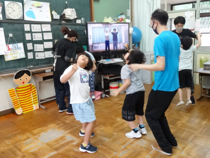 挨拶をした後,最初に,「レッツ,ジャンプ!」のダンスをしていました。今日,初めて踊ったそうですが,お手本のビデオを見ながら,とっても楽しそうにダンスしています。