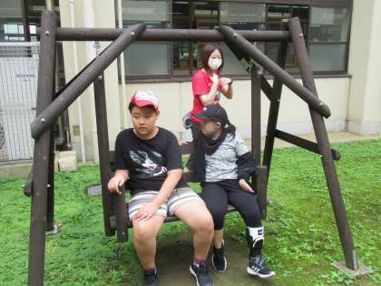 小学部6年生が,中庭のブランコに友達と一緒に楽しそうに乗っていました。