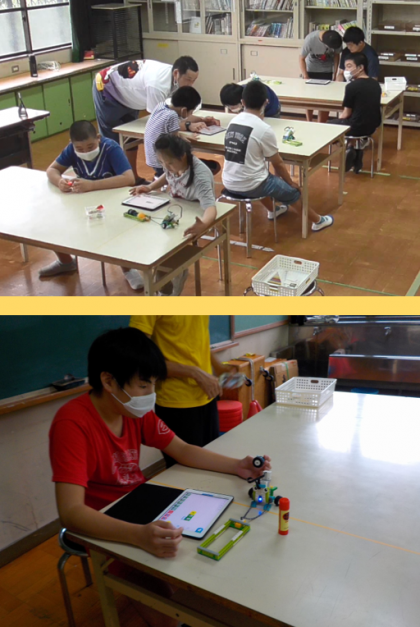 昨年度は高等部の生徒を中心にプログラミング学習を行ないましたが、本年度は中学部でもプログラミング学習に取り組みました。今回は「lego We do.2.0」を使っての活動です。タブレット端末でプログラミングブロックを並べ、「スタート」ブロックにタッチすると、ロボは動きます。ロボが動くとみんなは「おぉー」とびっくりしていました。ロボの速さを変えたり、タイヤの大きさを変えたり、音楽を流してみたりと、いろいろと試す姿も見られました。