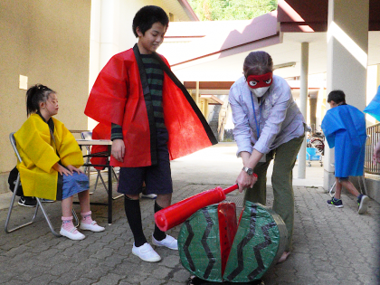今日は,プレ秋まつりということで,美化委員会の生徒が職員室や校長室に,「さかなつり や すいかわりをしてください」と誘いに来てくれました。魚を釣ると竿がブルブルする工夫があったり,スイカが気持ちよくパカッと割れる等,大変盛り上がって楽しめました。