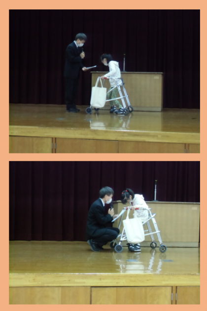 終業式のあと,「京都市幼児・児童・生徒作品展」「姉妹都市交歓作品展」の表彰があり,代表の児童が賞状を受け取りました。