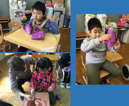 「いもほりよいしょ」の読み聞かせを聞いた後,前回みんなで作った芋のツルを引っ張って,いもほりゲームをしました。