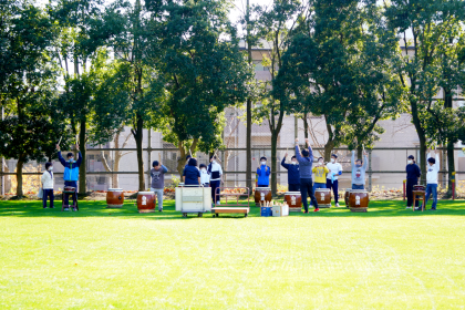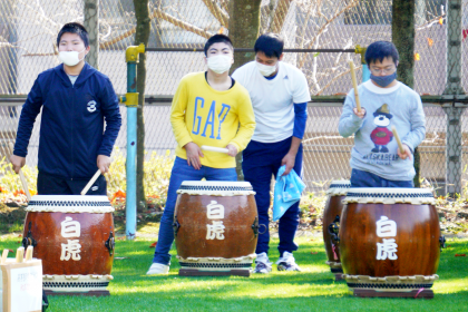 高等部の和太鼓ユニットが,青空晴れ渡る緑の芝生グラウンドの上で和太鼓の練習をしていました。全員のリズムが随分と整い,心地よい音を聴かせてくれるようになってきました。