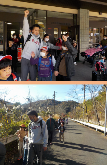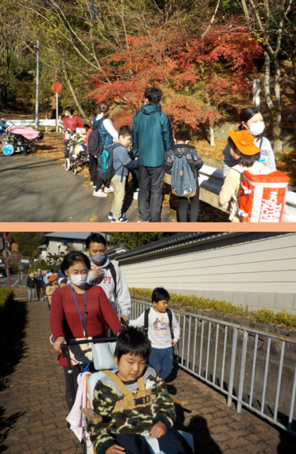 赤や黄色に色付いた葉っぱやどんぐり,まつぼっくりを見つけたり,先生と一緒に信号の色を確認して横断歩道を渡ったりしながら,たくさん歩くことができました。