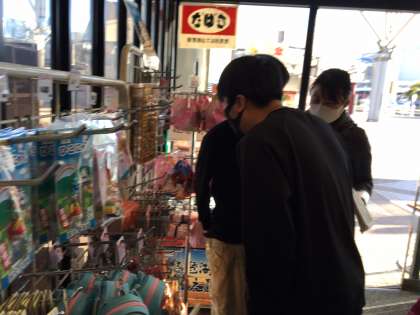お土産を選んだり,買ったりしています