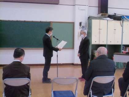はじめに,昨年度まで9年間学校運営協議会委員としてご活躍された前委員の鈴木晃司様への感謝状贈呈式を行いました。この感謝状は,長年委員として学校運営に参画していただいた方に,その功績を称えて教育委員会より贈呈されています。