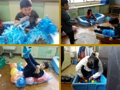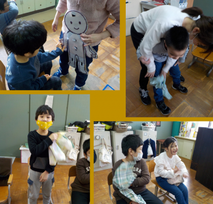 身体の部位の名前を確認しながら「からだパズル」をしたり,歌に合わせてタオルでこすったり・・・それぞれのチームに分かれて練習をしました。身体をしっかり洗った後は,お風呂にドボン!テープ風呂,ボール風呂,風船風呂,電車風呂等・・・様々なお風呂に入りました。お家でもゴシゴシ洗えるようになるといいですね♪