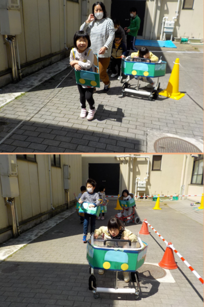 名前を呼ばれてみんなの前で返事をしたり,電車ごっこをしたりしました。