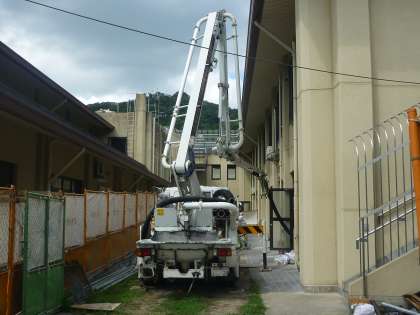夏休み中に,大きな機械等が撤去された部屋に,先日(8月31日),生コンクリート車でコンクリートを入れました。まだまだ,どんな教室ができるのかイメージできる状況ではありませんが,温水プールがすっかり撤去されて,新しい教室へと変化していっています。「多目的な教室」が完成するのをとても楽しみにしています。