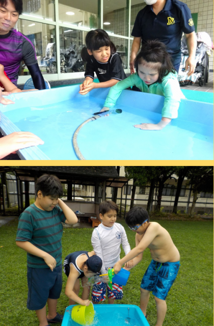 水を掛け合ったり、上から降ってくる水に驚いたり、触ったりと存分に楽しみました!