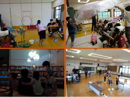 20日(火)に小学部で「夏のつどい」をしました。今年度は各学年が「バルーン」や「花火」「学年ダンス」「卓球バレー」など、学年で取り組んでいる活動を遊びのコーナーにしました。やってみたことのない卓球バレーに夢中になったり、友だちと大玉をころがしてみたり、花火の映像をくぎ付けでみたり、紹介ビデオで見たようにフリスビーを投げてみたり、それぞれが楽しそうに取り組む姿がたくさんみられました。