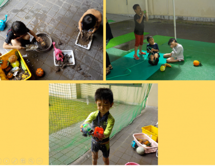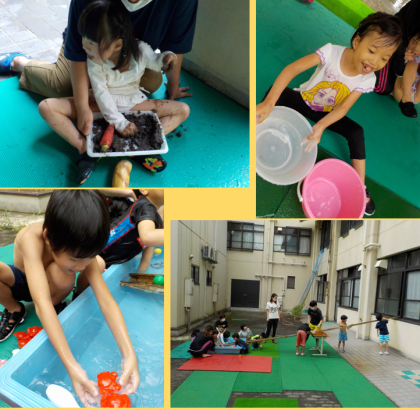 今週は,泥遊びをして汚れた野菜や車の水洗いをしたり,あさがおの色水を作ったりしました。