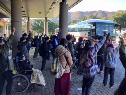 ※保護者の皆さま,休日にも関わらずお見送りありがとうございました。本日は休日のため,ホームページのアップは今回の出発式だけになります。1日目の様子は明日まとめてアップします。