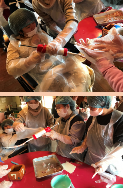 混ぜたものをピストル型の調理器具に入れて、腸詰めします。