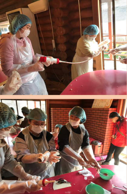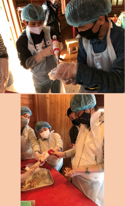 肉を押し出す役割と腸を引っ張る役割とで息を合わせて作りました。