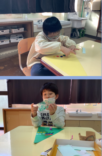 シールやクッションボールなど好きな材料を選んで,画用紙に貼りました!