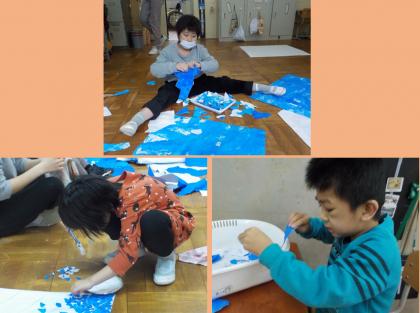 24日(水)に全員揃って集合写真を撮り,25日(木)に文化の部の背景画をちぎり絵にしました。全員で力を合わせてちぎった貼り絵は12月の地域作品展(サンサ右京)に出展予定です。撮影会の後は衣装を着て体育館で遊びました。