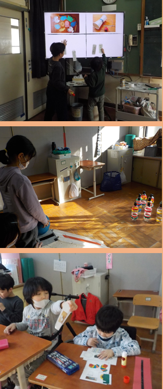「おもちゃづくり」の活動をしました。1回目の学習では,「魚つりゲーム」「パラバルーン」「ボウリング」の活動をしてどの活動が楽しかったか発表するグループと,「魚つりゲーム」「けん玉」から作りたいおもちゃを選んで,作るためには何が必要か考えるグループに分かれて活動しました。2回目の学習では,それぞれのグループが楽しかったと発表したおもちゃや作りたいと選んだおもちゃを作ってそれを使って活動しました。自分たちで作ったおもちゃであるからこそ,「大切に使おう」とする様子や「作った達成感を感じてより活動に楽しむ」様子が見られました。
