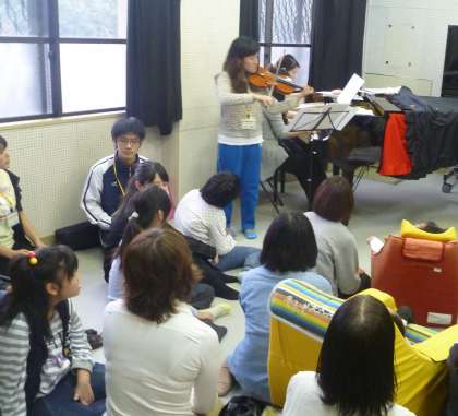 昨日から今日まで,介護等体験の学生が来ています。午前中は中学部2年生の学年ライフスタディで,午後からは総合的な学習のミュージックコースで得意の楽器を奏でたり、美しい歌声を聞かせたりしてくれました。