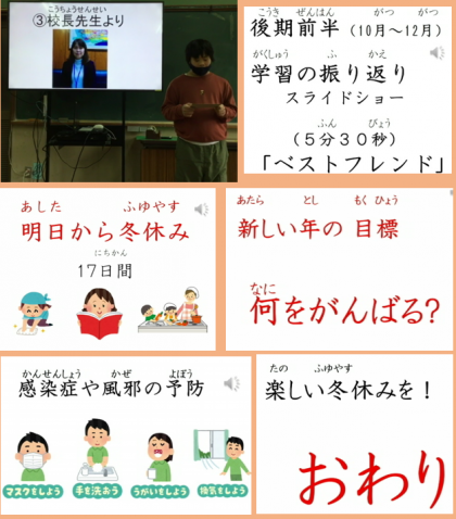 校長先生のお話では,後期前半をスライドショーで振り返り,冬休みに学校で学習したことをお家で発揮しようということや,来年がんばることを考えようなどのお話がありました。