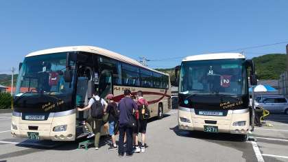 お世話になった旅館『鯛丸海月』をバックに記念撮影。