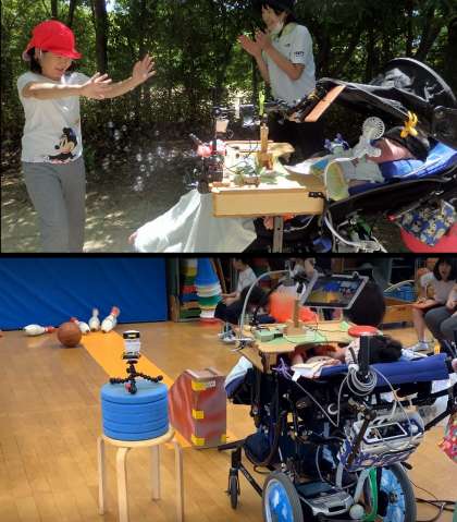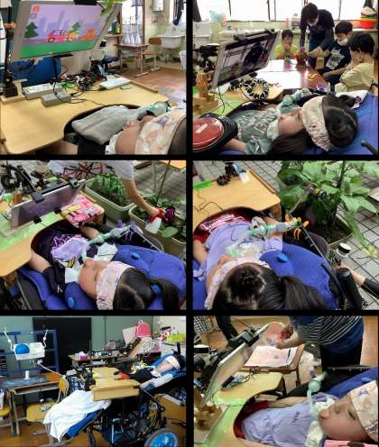 児童は昨年度までに,まぶたの動きで端末を操作してきています。また,タブレット端末に周囲の映像をカメラで映すことで,バギー上からでも周りの様子がよく見えるようにしています。