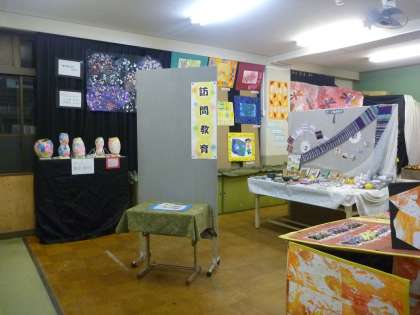 図工室では,ワークスタディの製品やわくわくクラブの作品,訪問教育の児童の作品,小学部,中学部,高等部の児童生徒の作品が展示されています。修学旅行や宿泊学習の思い出新聞もあります。