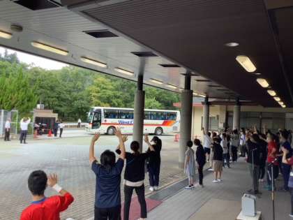 2台の観光バスに分かれて乗り込み,たくさんの先輩や後輩に見送られながら出発しました。
