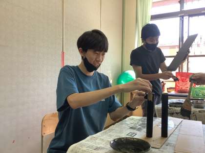 発表で使う道具や背景を作ったり,動きを覚えたりしています。