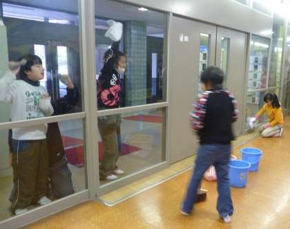 師走です。年末です。中学部のお掃除ユニットでは,一年間の汚れを落としてすっきりときれいにしようと,西総合支援学校の色々な場所のお掃除を始めました。今日は主に玄関のお掃除にかかりました。大きなガラスを磨いたり,雑巾がけをしたりと,丁寧に丁寧に取り組みました。