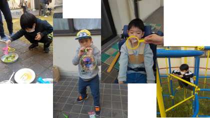 先日、中庭でシャボン玉をしました。「大きく膨らませたい!」と頑張ったり、シャボン玉を見て楽しんだりしました。「ふー」の練習をする児童もいました。また、遊具で遊びました。秋の風を感じながらたくさん身体を動かしました。