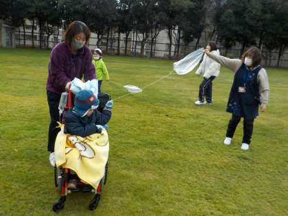 運動場で凧あげをしました。ビニール袋に好きな模様や絵を描いて自分の凧を作りました。友だちと一緒に走ったり、友だちや指導者があげた凧を見て笑顔になったりしました。