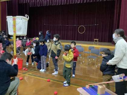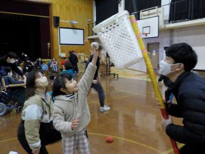 同じ学年の皆で力を合わせてボールを集める「玉入れ」や、他学年の友達とペアになって光るランタンを運ぶ「一緒に運ぼう」、そして、みんなで運んだランタンで「音・光遊び」をして楽しみました。