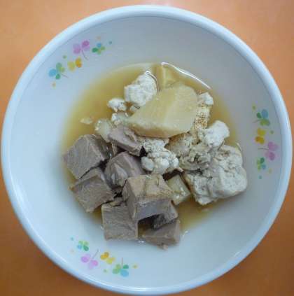 今日の給食は、焼き豆腐と旬のたけのこを炊きました。「なま節はカスカスしていて食べにくい」という感想を聞きますが、よく噛んで食べるとうまみがどんどん出てきます。