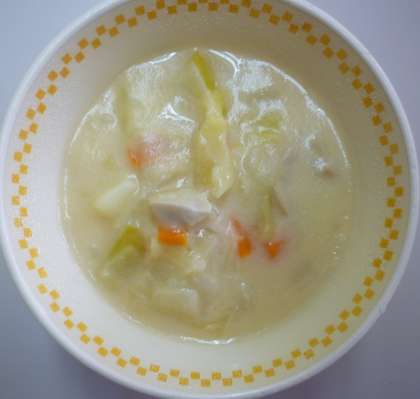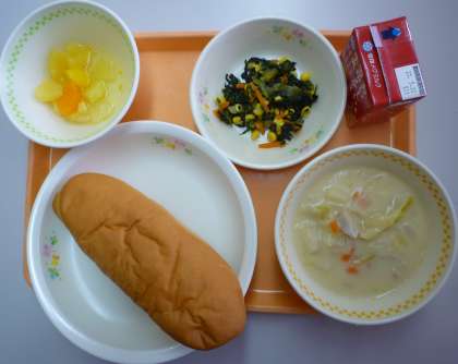 春キャベツがおいしい季節です。今日の給食は、春を味わってもらおうと考え、人気のクリームシチューに春キャベツを加えました。また、クリームシチューの時には、鶏肉を使うことが多いのですが、今日はフランクフルトソーセージにしました。フランクフルトソーセージ、野菜を煮てうま味がたっぷり出たところに、手作りのホワイトソースを加えてコトコト煮込んで仕上げました。キャベツを加えたことでコクはあるけれど、あっさりしたシチューになりました。