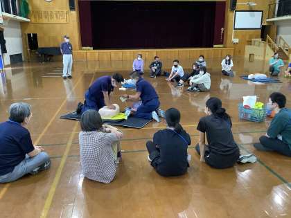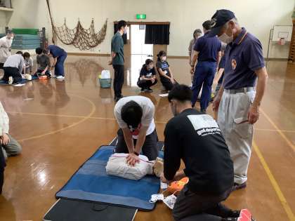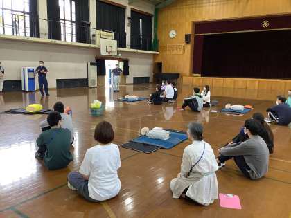 本日西京消防署員の方を講師に招き、普通救命講習会を行い心肺蘇生法やAEDの使用について学びました。