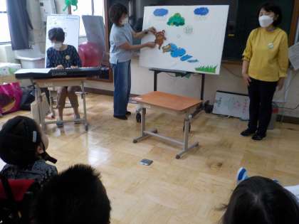 ひなたぼっこの会の皆さまに来ていただき、本の読み聞かせをしたり、歌を歌ってたりしていただきました。子どもたちは、学習で親しみのある絵本や音楽を楽しんでいました。