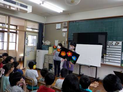 ひなたぼっこの会の皆さまに来ていただき、読み聞かせをしていただきました。歌に合わせて花の飾りを咲かせたり、歌や音楽に合わせてパネルシアターを使ったお話を見聞きしたりして、とても楽しい時間を過ごすことができました。